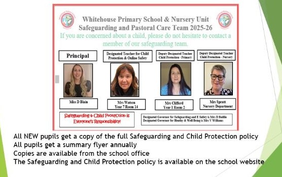 In addition to our whole school ethos Whitehouse Primary School & Nursery Unit has a Safeguarding and Pastoral Care Team. This team is led by Miss Blain and Mrs Watson and they are supported closely by Mrs Clifford and Mrs Spratt. Mrs Baillie (Chairperson of the Board of Governors) is also a member of the team and receives regular updates and attends meetings throughout the year.